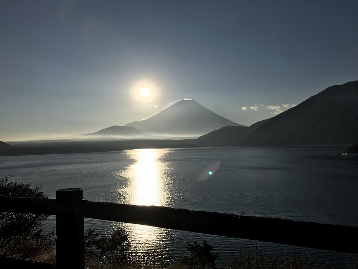 本栖湖畔にて撮影。朝陽を浴びて後光が差しているかのような富士山。